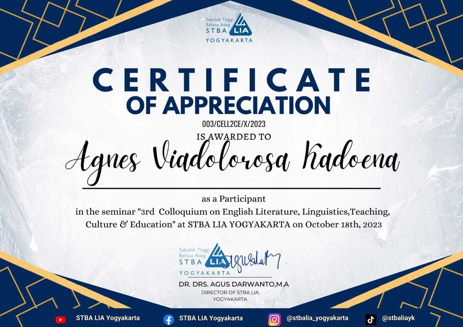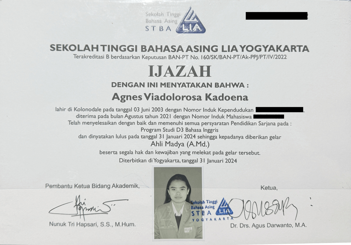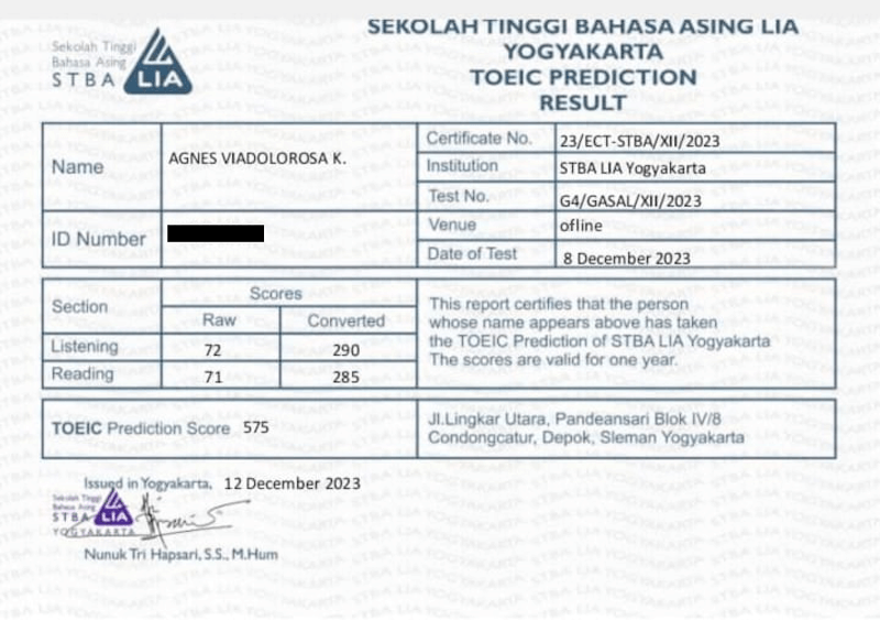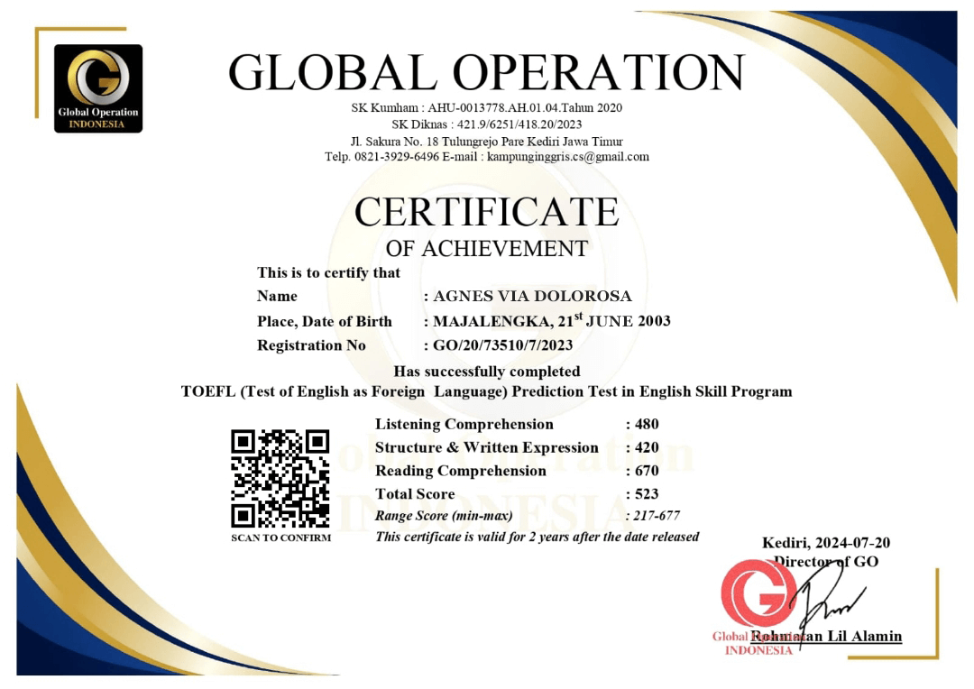 • Lulusan Universitas Sekolah Tinggi Bahasa Asing LIA Yogyakarta dengan spesialisasi English dan France Language • Lulus ujian IELTS, TOEFL, dan TOF dengan nilai unggul pada tahun 2023 dan 2024 • Sebagai ASDOS di UNIVERSITAS TI Kalimantan Barat selama masa study