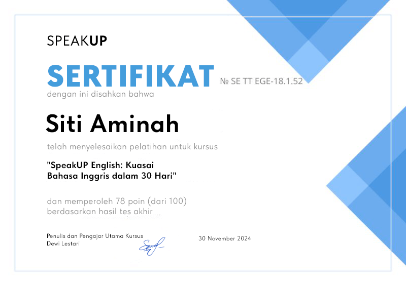 Setelah berhasil menyelesaikan kursus dan lulus ujian, Anda akan menerima sertifikat atas nama dari sekolah